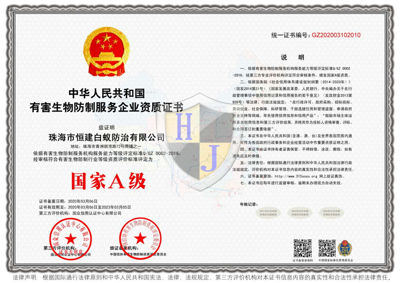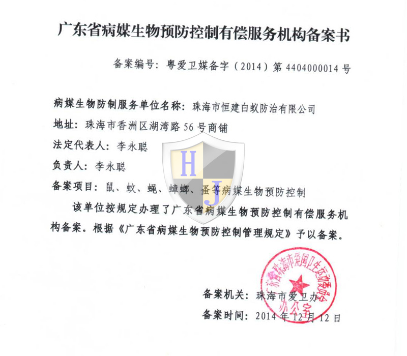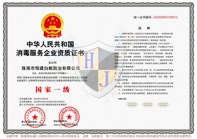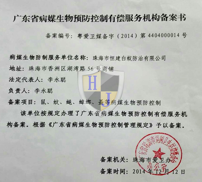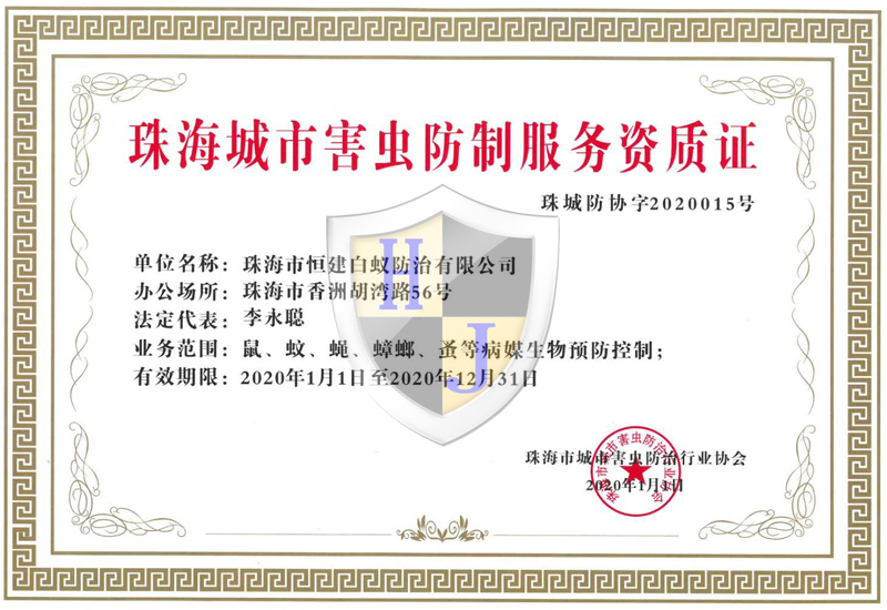 經(jīng)多年專注誠信經(jīng)營,公司獲得國家級有害生物防制A級資質(zhì)證書、國家級消毒一級資質(zhì)證書,通過廣東省病媒生物預(yù)防控制備案、市愛衛(wèi)辦頒發(fā)病媒生物備案證明、廣東省守信用重合同企業(yè)榮譽(yù)、城市蟲害行業(yè)等多項資質(zhì)。